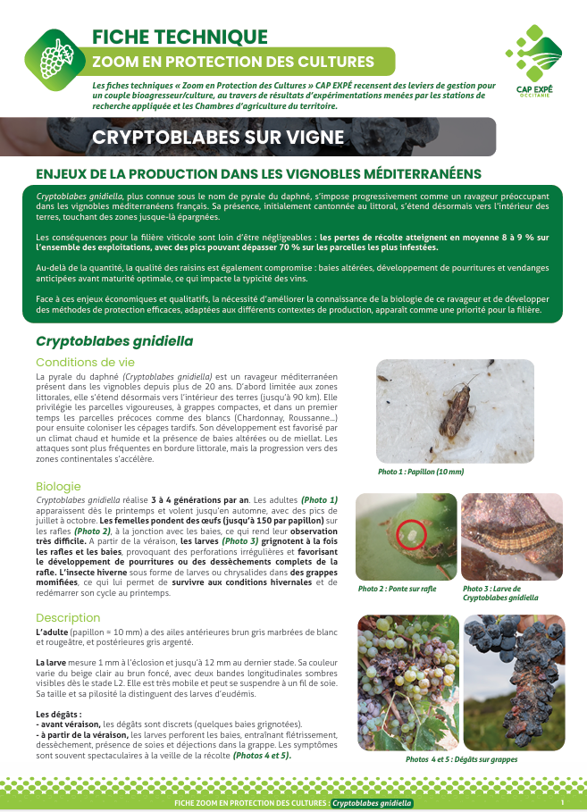 La Fiche n°2 est dédiée à la gestion de Cryptoblabes dans les vignobles méditerranéens, en collaboration avec la CA30 et la CA34.
